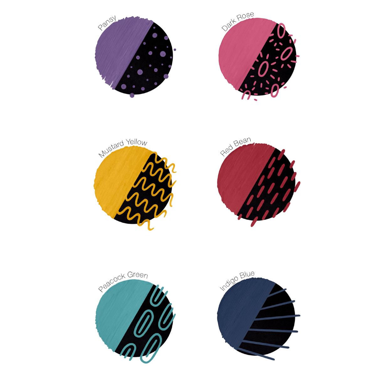 Enthaltene Farben: Pansy, Dark Rose, Red Bean, Mustard Yellow, Peacock Green, Indigo Blue.