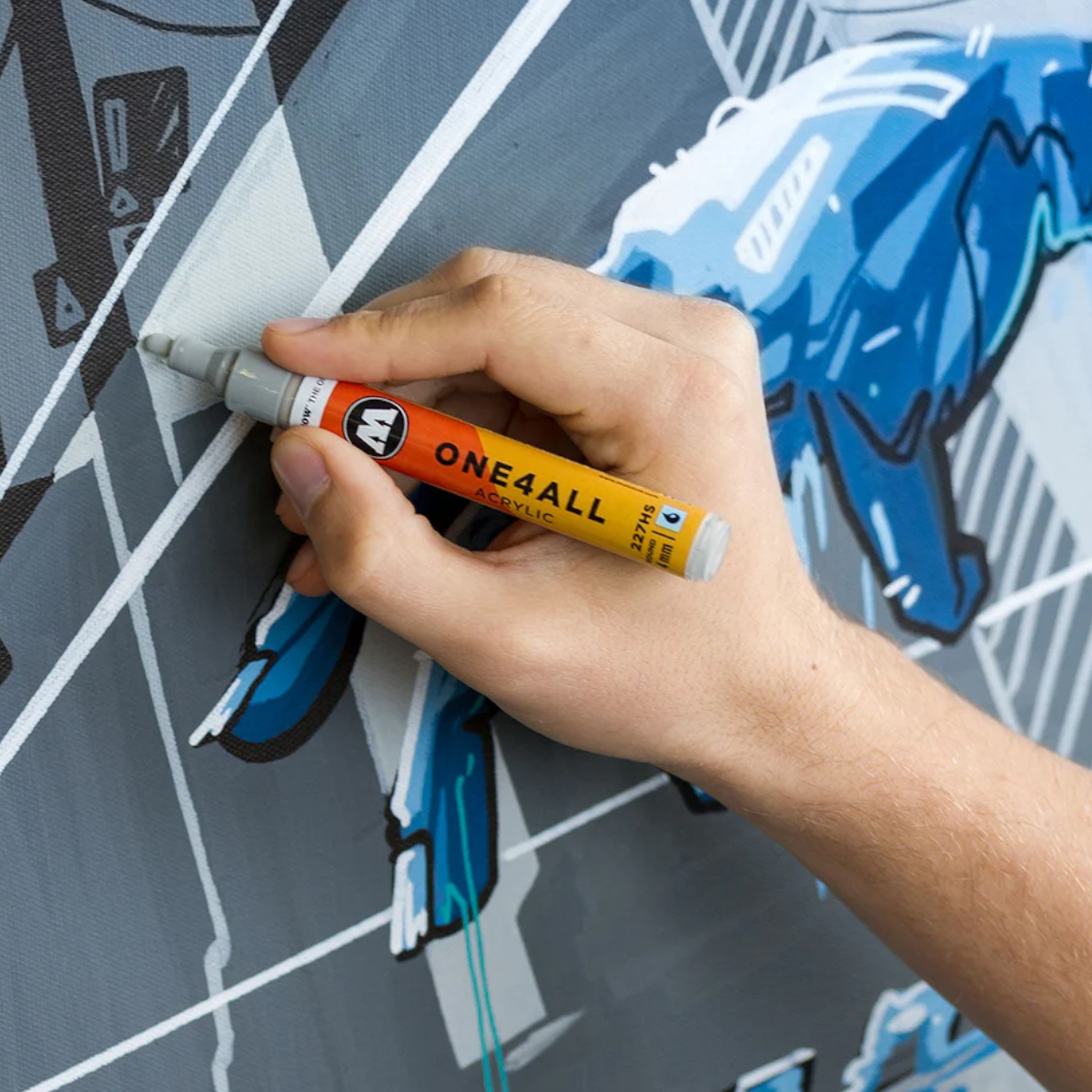 Der One4All 227 HS ist der optimale Stift, wenn es um künstlerische Gestaltung mit hochdeckenden Farben auf vielen unterschiedlichen Untergründen wie Papier, Leinwand, Stein, Holz oder Metall geht. Zur Wiederbefüllung gibt es die Molotow One4All Refill Ink. Standardmäßig kommt er mit 4mm Rundfilz Tip, das mit dem patentierten Kapillarsystem konstanten Farbfluss gewährleistet.