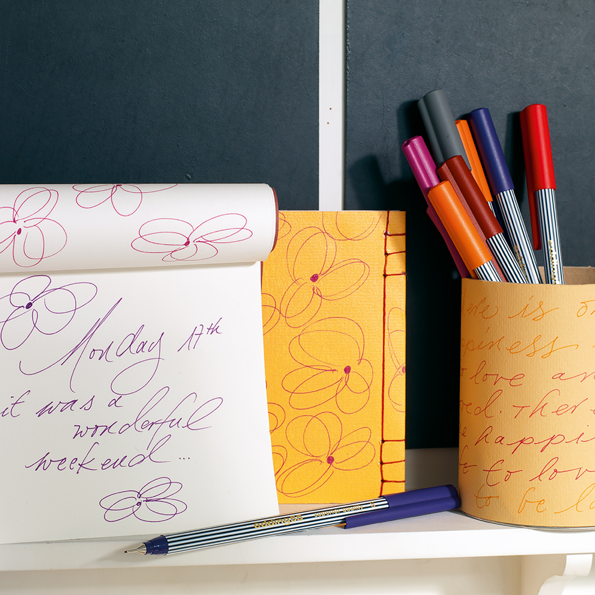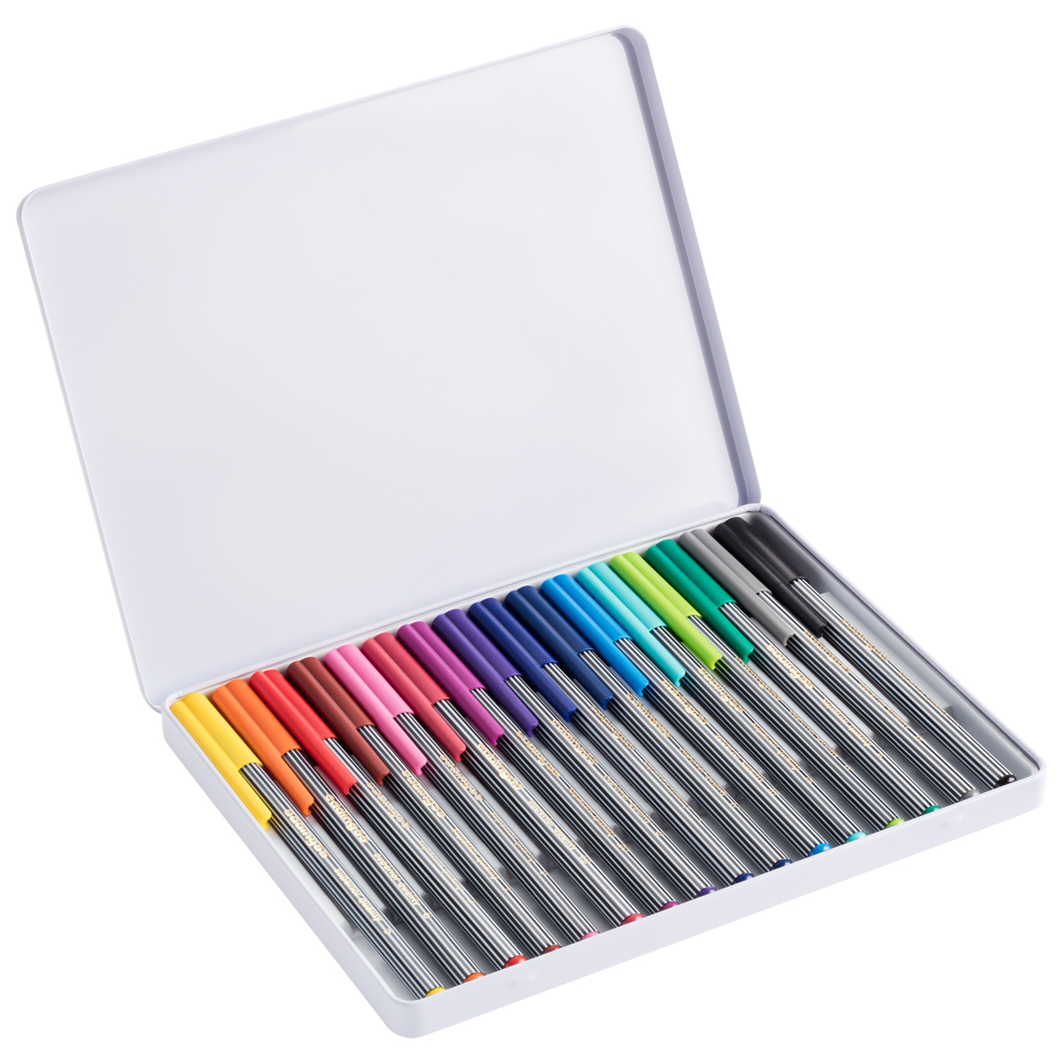 Der Edding 55 ist ein Fineliner mit einer metalgefassten Kunststoffspitze und 0,3mm Strichstärke. Geeignet zum kreativen Schreiben, für Notizen, Skizzieren, Zeichnen oder Layouts. Das Set enthält 16 unterschiedlich brillante Farben deren Tinte auf Wasser basiert. Die 16 Edding 55 Stifte kommen in einer praktischen Metallschachtel zu dir nach Hause.