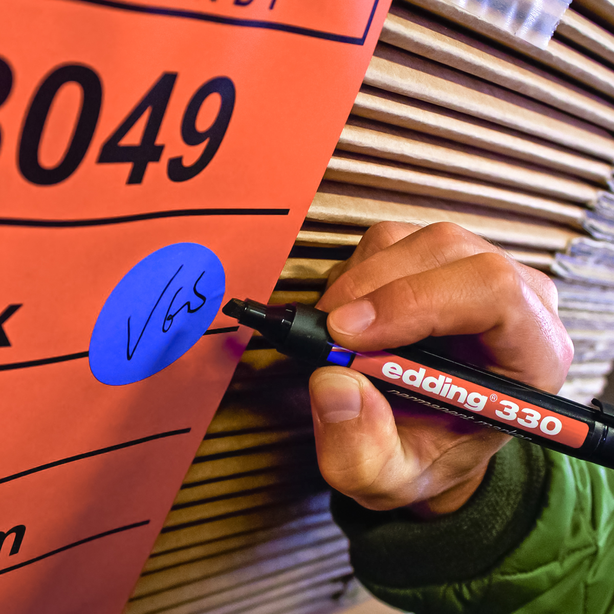 Permanentmarker zum Markieren und Beschriften fast aller Materialien, z. B. Papier, Karton, Metall, Kunststoff und Glas. Die Keilspitze verfügt über eine Strichbreite von 1-5 mm. Wasserfest und abriebbeständig auf fast allen Oberflächen. Das Produkt ist nachfüllbar mit edding MTK 25 Nachfülltinte. Die Tinte ist geruchsarm und ohne Zusatz von Toluol/Xylol.