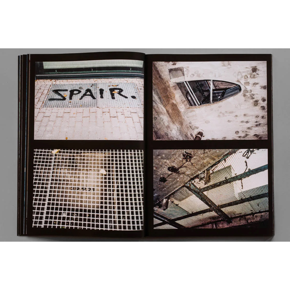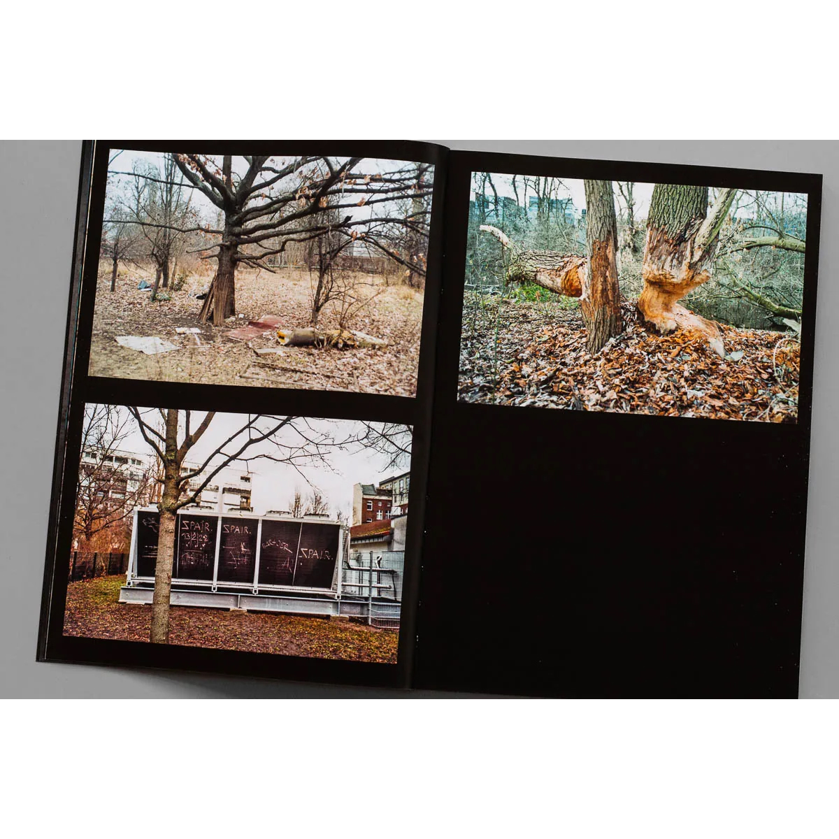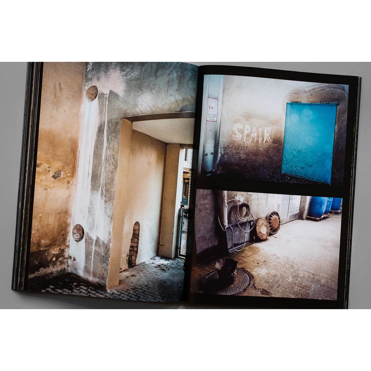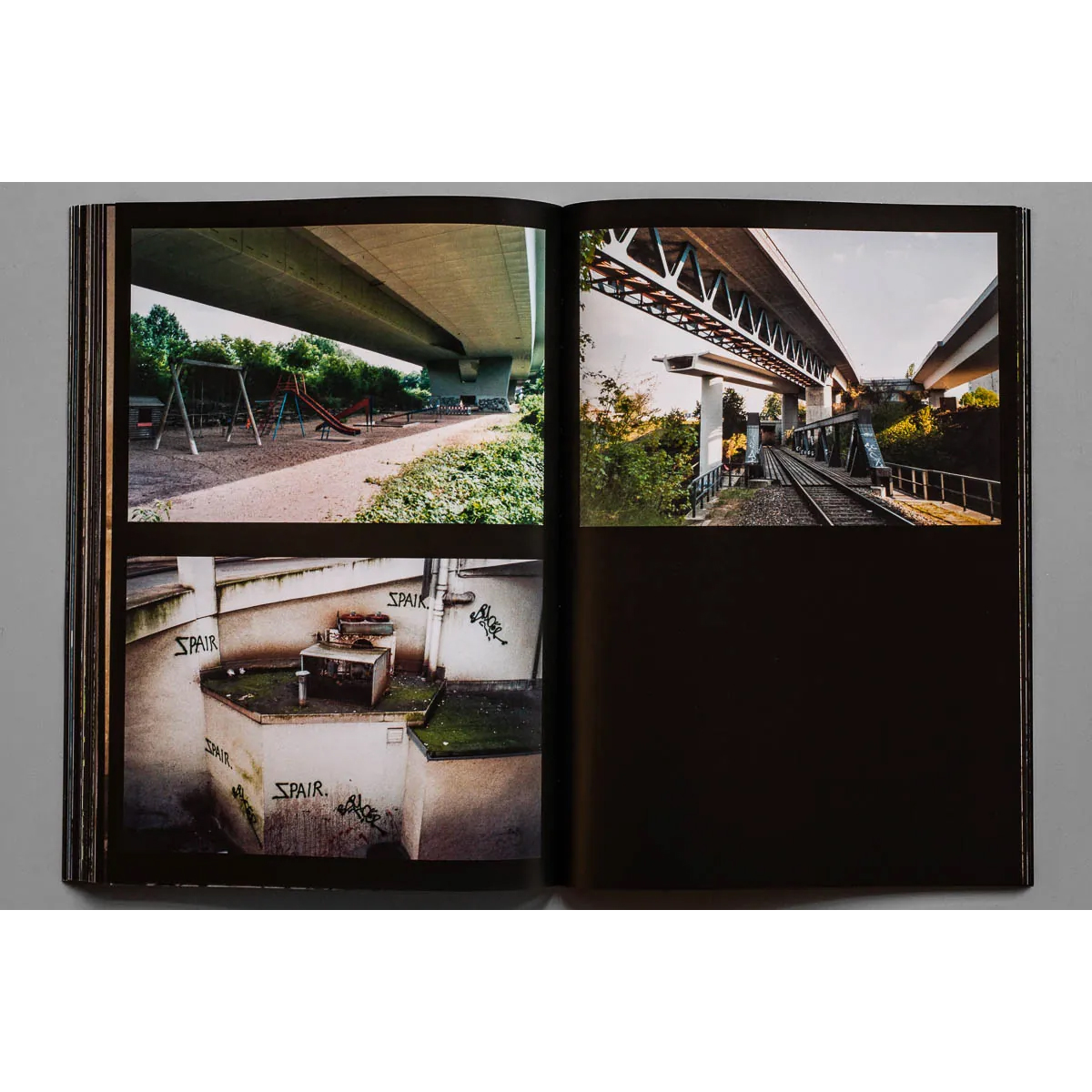 Einmal mehr ist der Leser eingeladen, ihn auf seinen außergewöhnlichen Erkundungstouren durch das Stadtbild zu begleiten. Baulücken, verwilderte Hinterhöfe, versteckte Räume in Brücken oder zwischen Gebäuden: SPAIR hat offensichtlich eine ganz eigene Karte von Berlin und entdeckt Orte, die ein Stadtplaner normalerweise nicht für den Normalbürger zugänglich machen wollte. Nichtsdestotrotz zeigen die atmosphärischen Analogfotos an den meisten dieser Stellen Spuren seltsamer menschlicher Aktivitäten, die manchmal Jahrzehnte zurückliegen.
