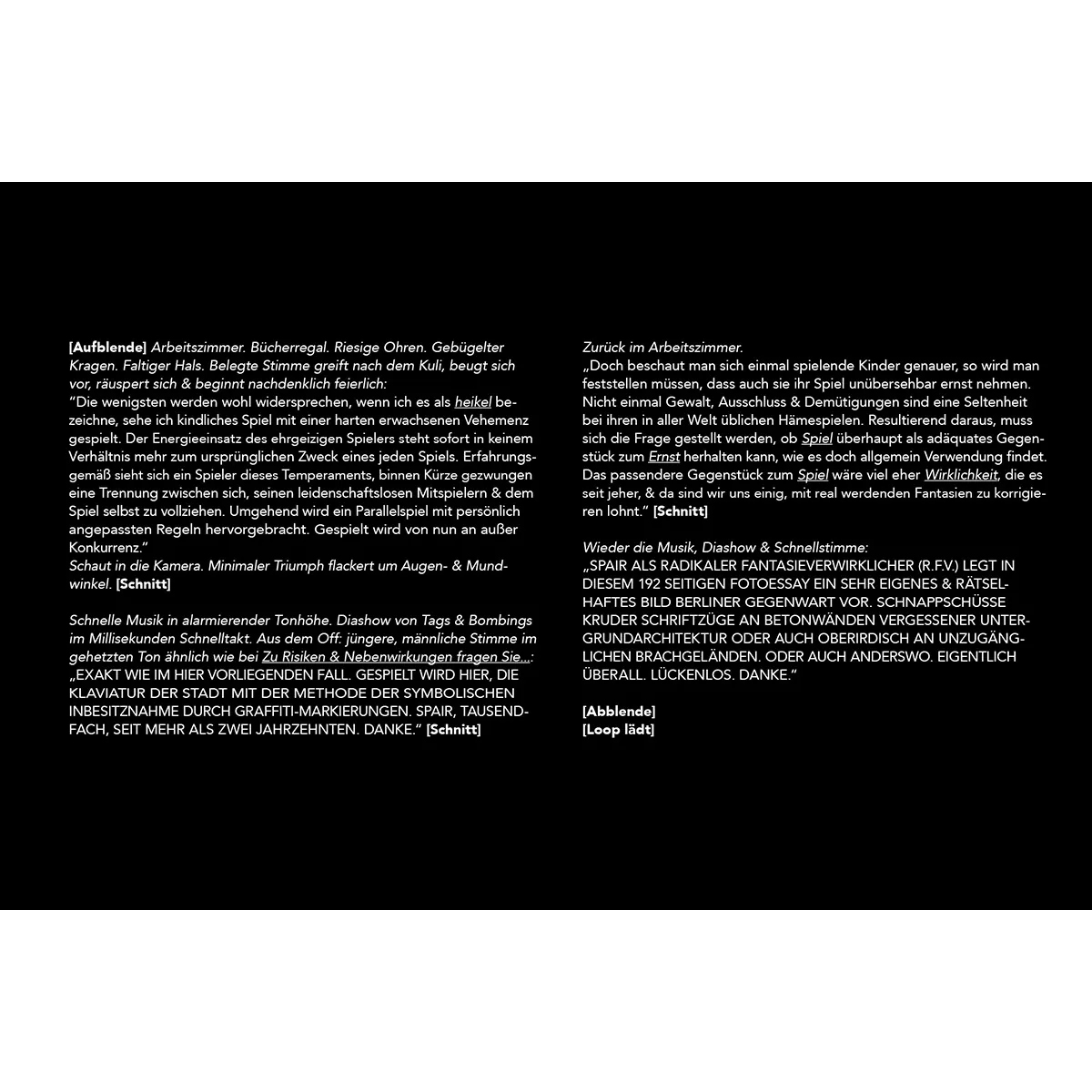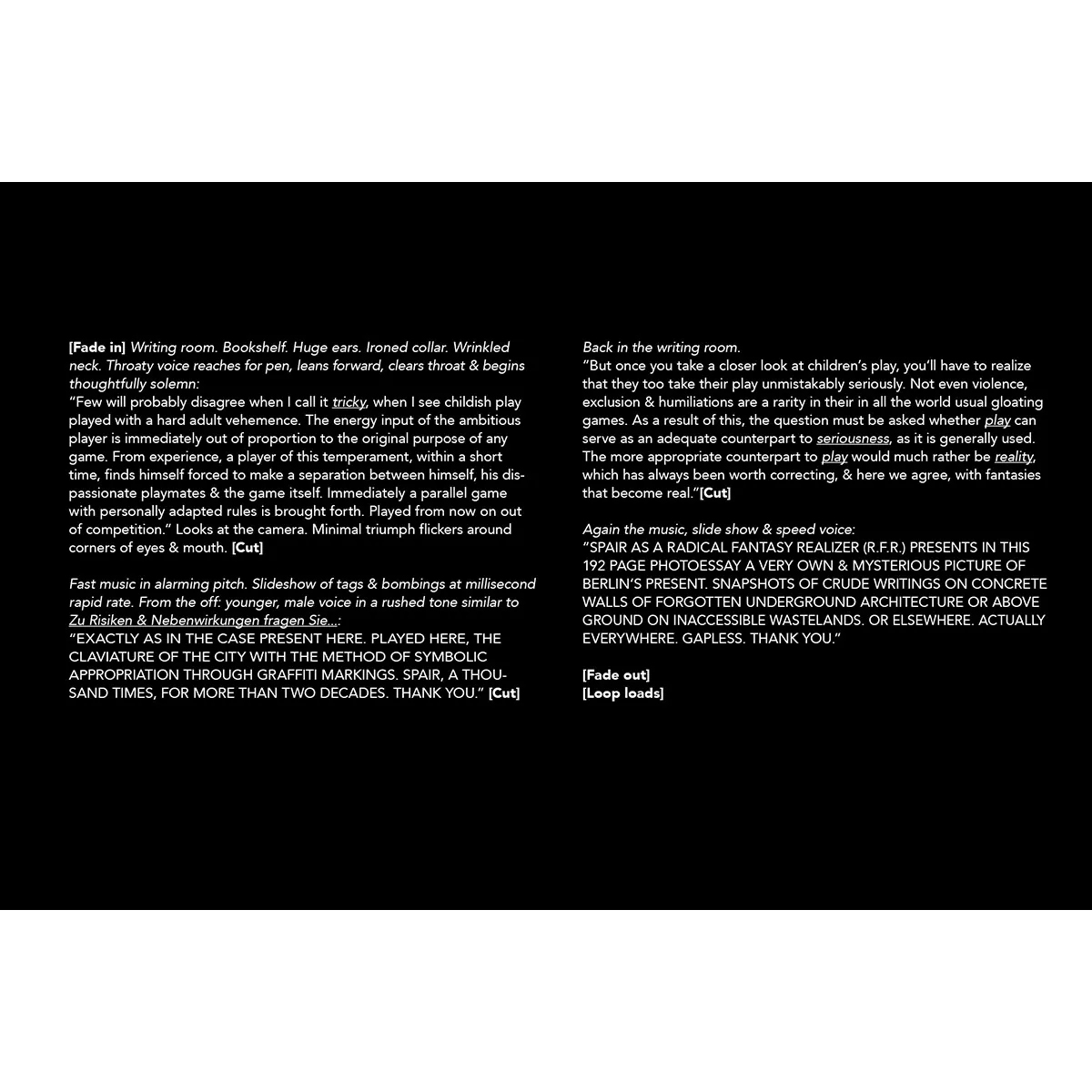 PLAY2HARD ist das neueste Fotobuch des Berliner Schriftstellers SPAIR über sein Spiel zum Erkunden und Verlassen der Stadt. Die Publikation stellt einen Schriftsteller vor, der als traditioneller Attentäter in der Stadt Berlin arbeitet. Doch es scheint noch einen zweiten Drang in seinen Werken zu geben: Das Bedürfnis, verborgene Orte zu erforschen und zu entdecken. Orte, an die die meisten Graffiti-Writer nicht gehen würden, oder wenn doch, würden sie selten darauf abzielen, dort ihre Spuren zu hinterlassen.