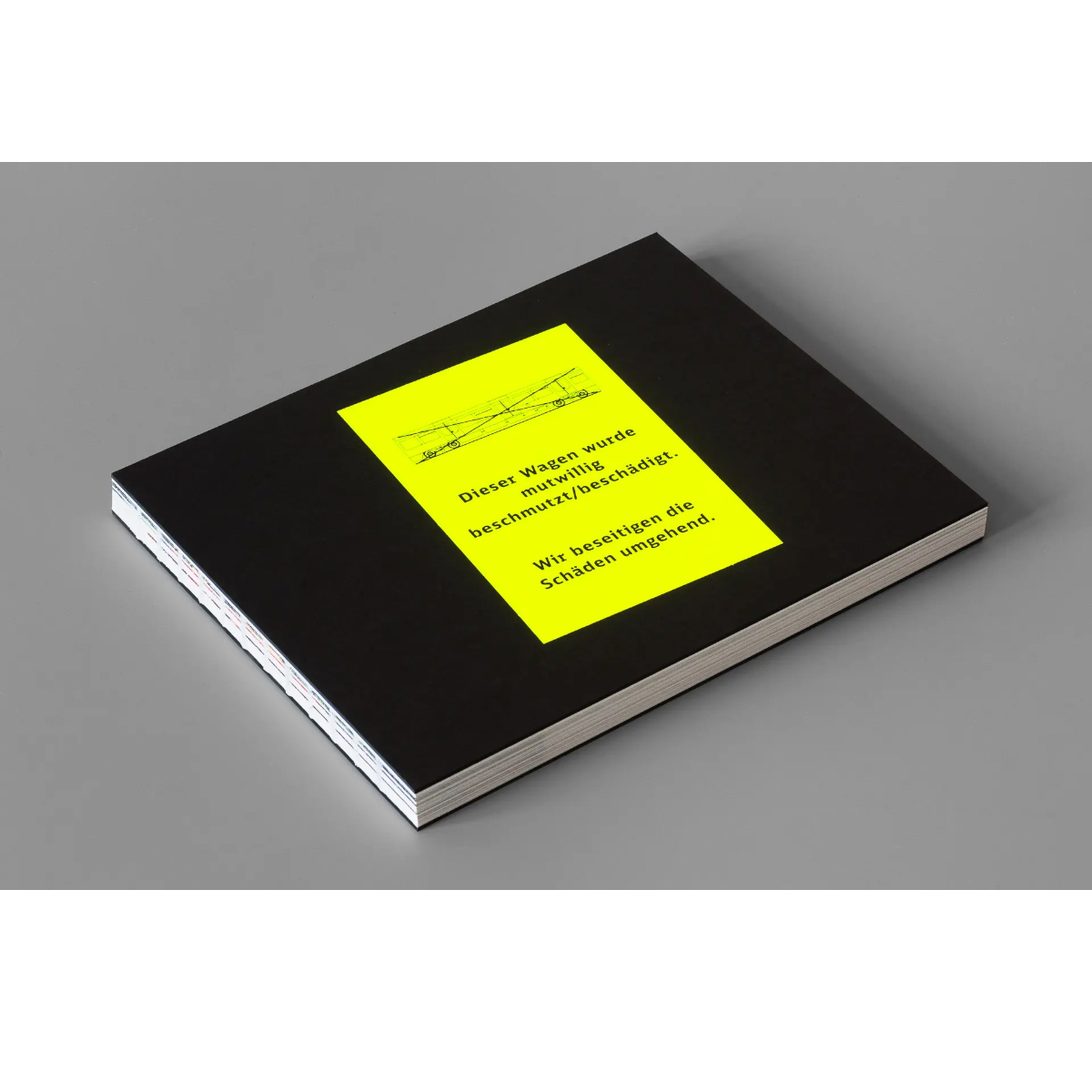 schwarzer Kartoneinband mit Neonaufkleber, offene Rückenbindung
