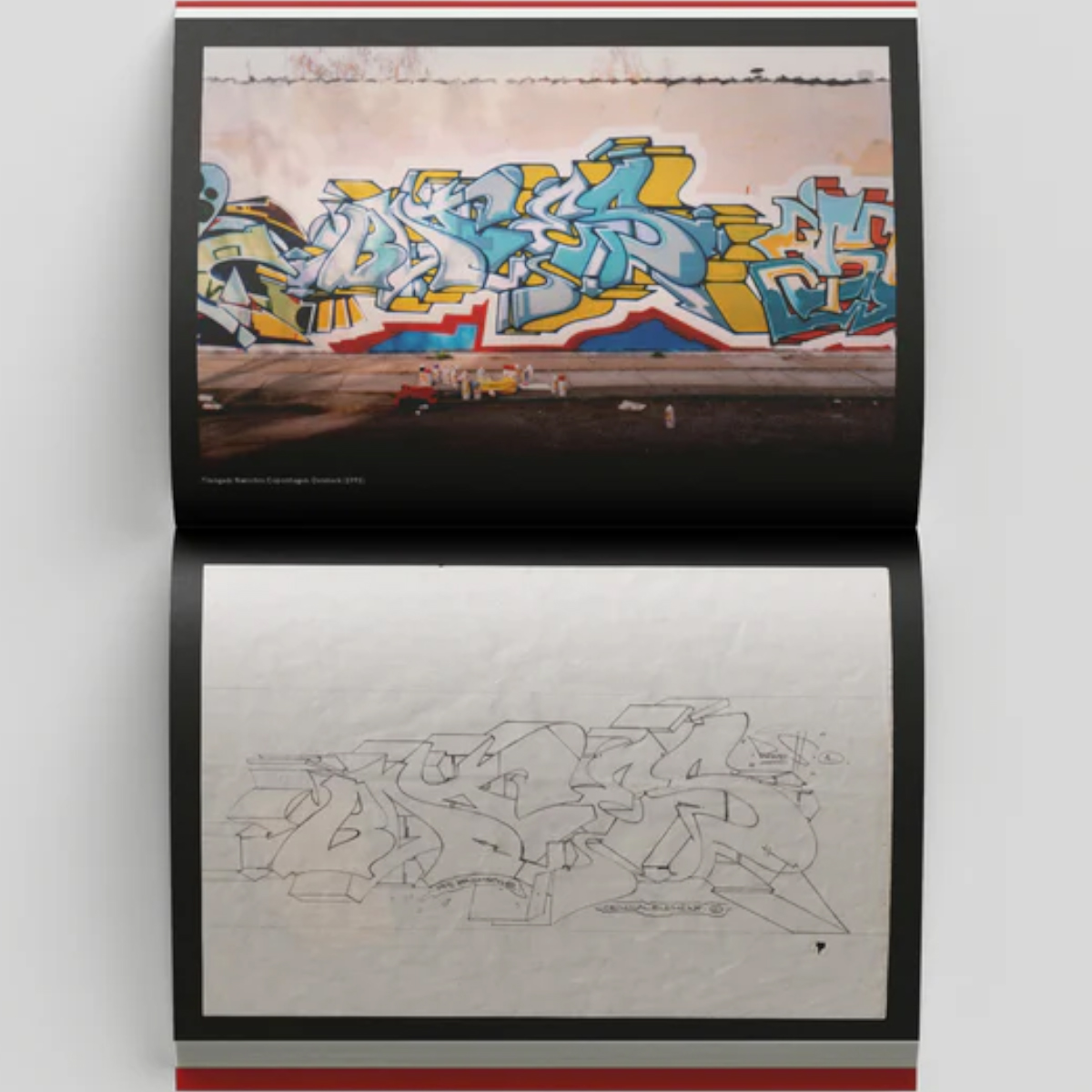 Einige Seiten gehen noch einen Schritt weiter und zeigen die Skizze neben dem fertigen Wandstück. Dieser einzigartige Vergleich ermöglicht es Ihnen, die Transformation zu studieren: Wurde die Skizze 1:1 auf die Wand übertragen? Tragen die Buchstaben denselben Fluss auf Papier und Beton? Gab es beabsichtigte Verschiebungen oder spontane Anpassungen?