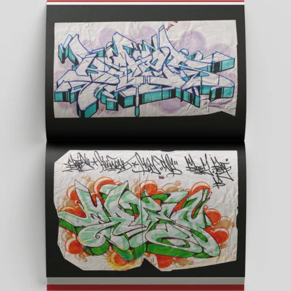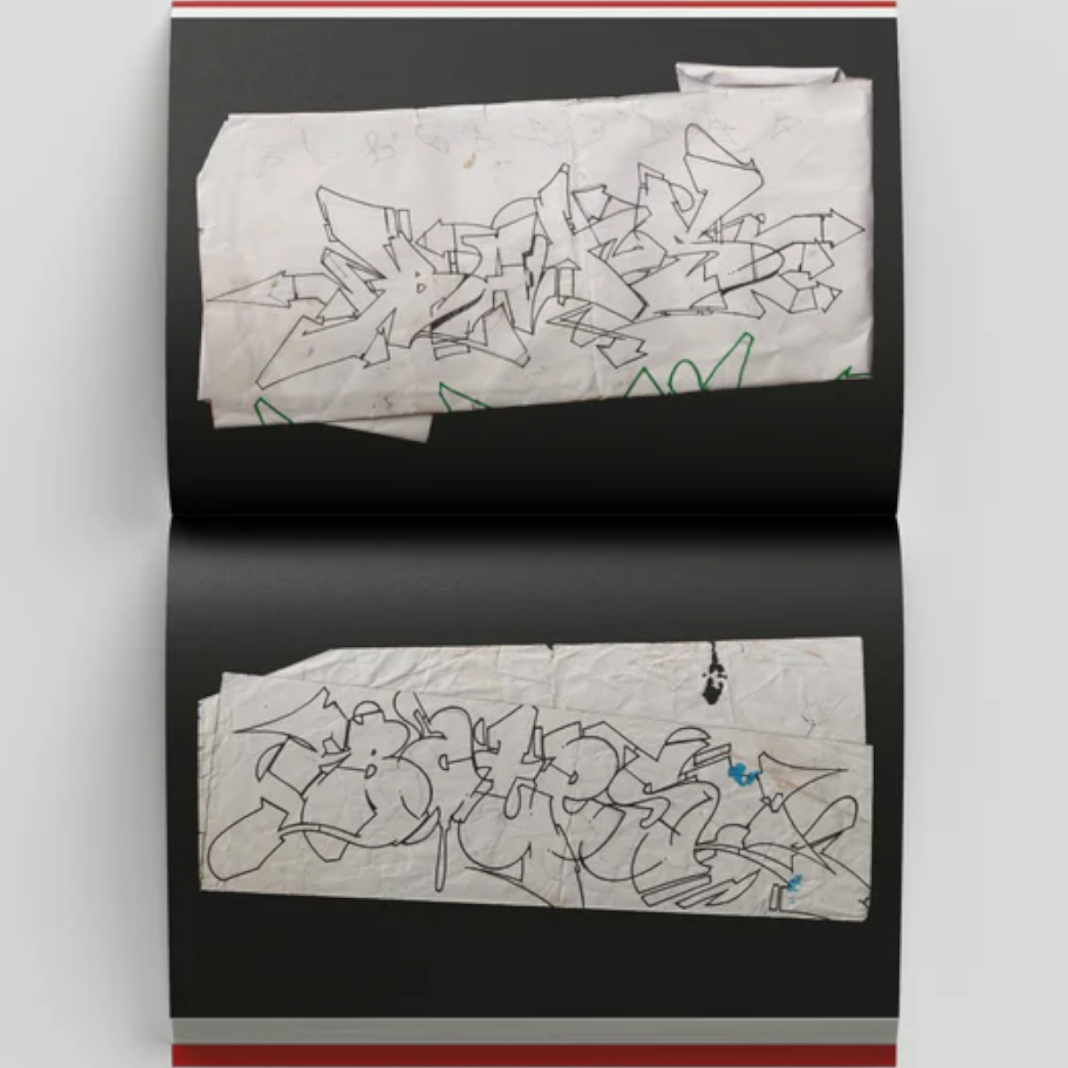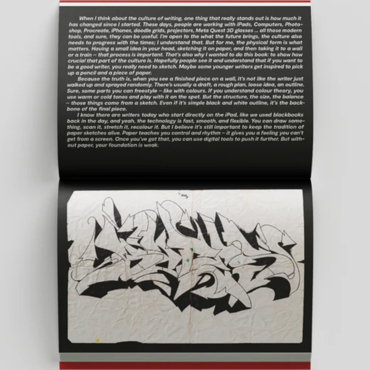 Aber dieses Buch ist anders: Es dreht sich ausschließlich um seine eigenen Skizzen. BATES hat sie alle aufgehoben – roh, authentisch und voller Energie. Tausende. Du wirst sie genau so vorfinden, wie sie sind: mit Farbe markiert, von Sprühstaub bedeckt, mit schnellen Notizen versehen, durch das Tragen in Taschen gefaltet oder durch Nächte im Freien gezeichnet. Jede Skizze bietet einen unmittelbaren Einblick in seinen Prozess und seine unermüdliche Hingabe zum Style.
