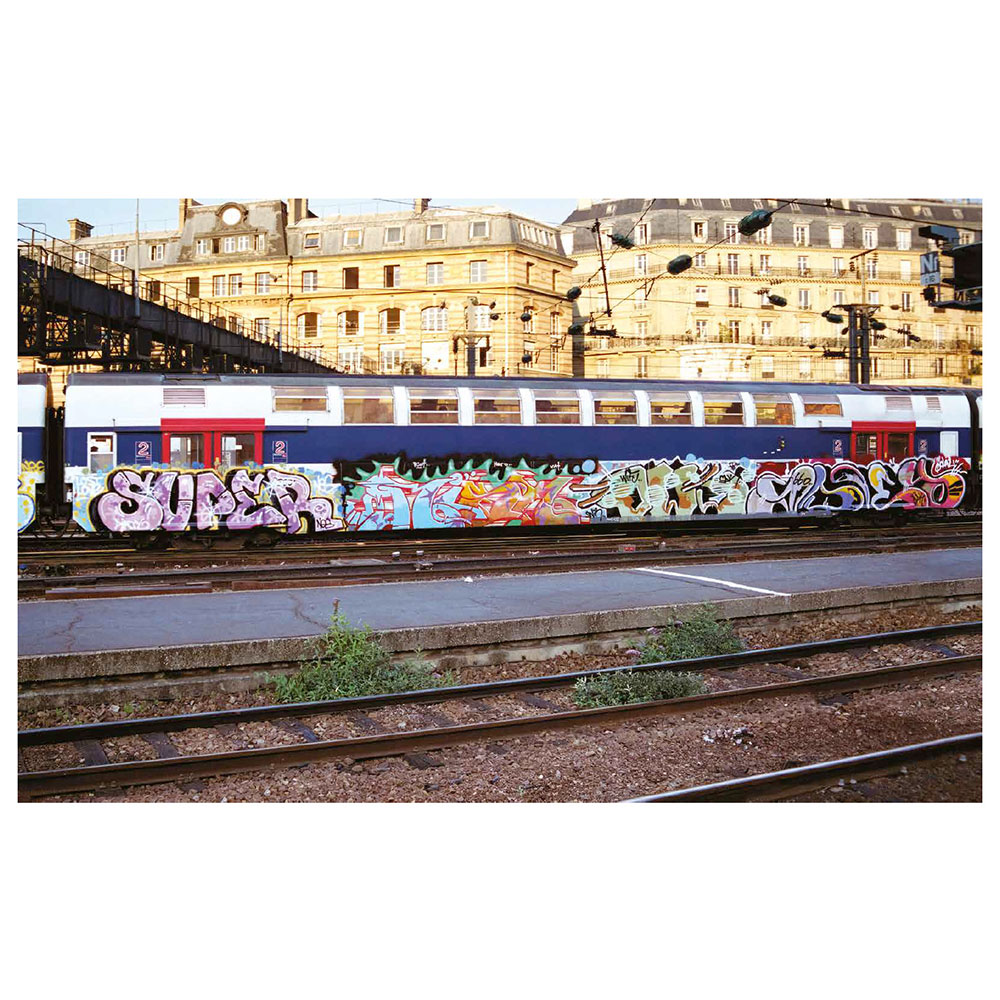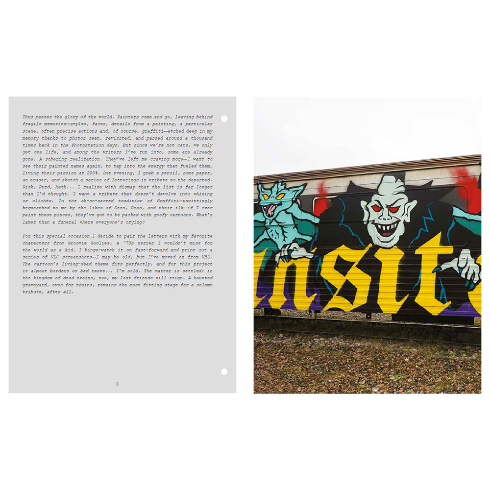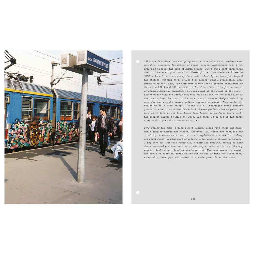 2001. After a decade of railway graffiti, Opak and the SDK crew stop painting trains in France, caught up in the legal system. Twelve years later, SNCF accelerates the scrapping of the country’s most beautiful trains and officially announces the death of the famous “petits gris.” That’s the trigger—Opak goes on a quest to paint all these legendary trains one last time. In the form of a logbook, Olivier Scuro reveals in the first volume of Painted Graves the details of this adventure and its origins in the 1990s. At the time, the most talented graffiti writers from the international scene join them on their missions. Among them, Risk (Finland), Stone (France), Remo (Switzerland), Math (Netherlands), Nesh (Austria), Choc (Belgium), Ruzd (Germany), and Aone (USA)… All passed away at the height of their passion. In Painted Graves Volume 2, Olivier Scuro keeps digging into graffiti archives and pays tribute to friends lost too soon: travels, flashbacks, and the quest that comes to an end. Most of these trains—painted or not—have now disappeared as well. 248 pages featuring Opak, Risk, Stone, Remo, Math, Nesh, Choc, Ruzd and Aone, but also Kaos, Micro, Lyte, Sharp, Rough, Jiwee, Inxs, Pum, Honet, Riot, Foe, Vino… Text in English and French.