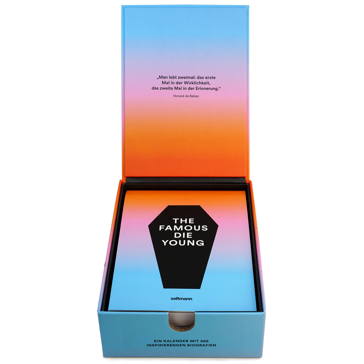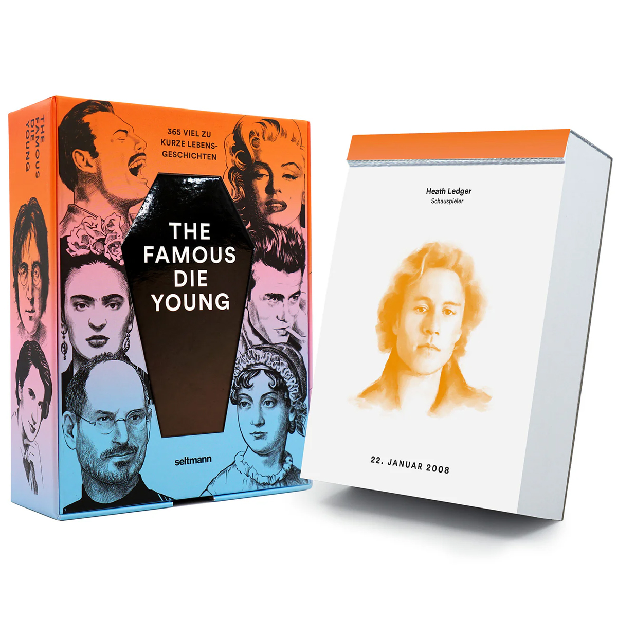 The Famous Die Young – Ein Kalender mit 366 Ikonen und ihren zu kurzen Lebensgeschichten. 365 Todestage, 365 Todesarten, 365 spannend erzählte Biografien. Gute Geschichten entbehren zuweilen nicht einer gewissen Tragik. Und was mutet tragischer an als ein viel zu früher Tod? Der kurzweilige Tageskalender spielt mit der Faszination für tragische, mitunter aberwitzige Todesfälle.