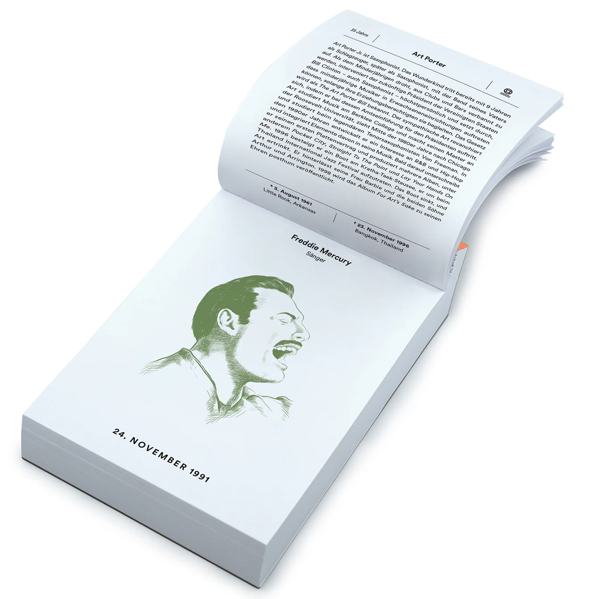 An jedem Tag im Jahr erzählt der Abreisskalender die inspirierende Lebensgeschichte einer zu jung gestorbenen Ikone. Ob James Dean, Jeanne d’Arc oder Friedrich Schiller – das plötzliche Ableben dieser Helden erschüttert die Nachwelt. Die Protagonisten sind Pioniere ihres Fachs, wahre Genies, mutige Erfinder, gefeierte Stars, gefallene Helden, tapfere Kämpfer, verarmte Denker, außergewöhnliche Sportskanonen und musikalische Ausnahmetalente.